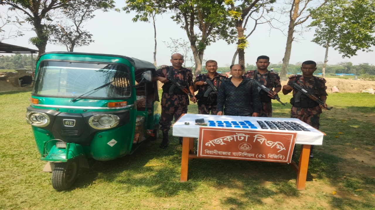 বিয়ানীবাজারের গজুঁকাটা বিওপি সীমান্তে ১০ হাজার পিস ইয়াবাসহ চিহ্নিত এক মাদক সম্রাটকে গ্রেফতার করেছে বর্ডার গার্ড বাংলাদেশ (বিজিবি)-৫২ সদস্যরা। এ সময় একটি অটোরিক্সাও জব্দ করা হয়।