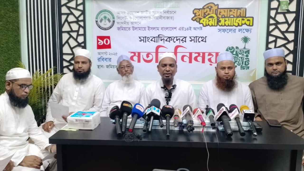 রোববার বিকেলে অনুষ্ঠিত বিয়ানীবাজার পৌর শহরে উপজেলা জমিয়তে ইসলামীর কার্যালয়ে দুই উপজেলার শীর্ষস্থানীয়দের উপস্থিতিতে মতবিনিময় সভায় গোলাপগঞ্জ উপজেলা জমিয়তের সভাপতি শায়খ আব্দুল মতিন নাদিয়ার সভাপতিত্বে গোলাপগঞ্জ জমিয়তে উলামায়ে ইসলাম বাংলাদেশ এর সেক্রেটারি মাওলানা আলী আহমদ সাংবাদিকদের উদ্দেশ্য করে বলেন, জাতীয় সংসদ নির্বাচনের লক্ষ্যে জমিয়তে উলামায়ে ইসলাম দেশব্যাপী ব্যাপক কার্যক্রম হাতে নিয়েছে। যার ফলে জমিয়তে উলামায়ে ইসলাম বাংলাদেশ এর কেন্দ্রীয় কমিটি একক প্রার্থী হিসেবে হাফিজ মাওলানা ফখরুল ইসলামকে সিলেট ৬ আসনে নির্বাচন করার জন্য মনোনীত করেছে।