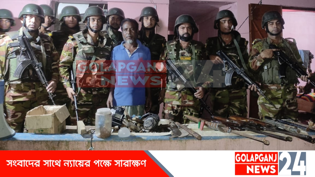 গোলাপগঞ্জে সেনাবাহিনীর অভিযানে অস্ত্রসহ মো: শাহীন আহমদ নামের এক ব্যক্তিকে আটক করেছে সেনাবাহিনী। রোববার ভোর ৫টার দিকে ঢাকাদক্ষিণ ইউনিয়নের দত্তরাইল লালমাটি গ্রাম থেকে তাকে গ্রেপ্তার করা হয়। এসময় তার কাছ থেকে ৪টি এয়ারগান উদ্ধার করা হয়। এছাড়াও তার কাছে অস্ত্র মেরামতের বিভিন্ন সরঞ্জামাদি ও দেশিয় অস্ত্র (২টি রাম দা, রড, স্টিল পাইপ) পাওয়া যায়।