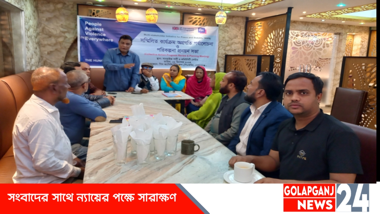 দি হাঙ্গার প্রজেক্ট এর প্রকল্প পিস ফ্যাসিলেটর গ্রুপ (পিএফজি) গোলাপগঞ্জ কমিটির সম্মিলিত কার্যক্রম অগ্রগতি পর্যালোচনা ও পরিকল্পনা প্রণয়ন সভা অনুষ্ঠিত হয়েছে।রোববার সকাল ১১টায় গোলাপগঞ্জের একটি অভিজাত রেষ্টুরেন্টে অনুষ্ঠিত সভায় সভাপতিত্ব করেন পিএফজি অ্যাম্বাসেডর ও গোলাপগঞ্জ পৌরসভার সাবেক প্যানেল মেয়র হেলালুজ্জামান হেলাল।