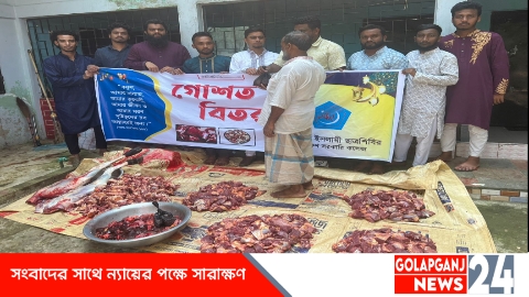 গোলাপগঞ্জে বাংলাদেশ ইসলামি ছাত্র শিবির ঢাকাদক্ষিণ সরকারি কলেজ শাখার উদ্যোগে গোশত বিতরণ করা হয়েছে। রোববার দুপুরে কলেজের কর্মচারী ও সাধারণ শিক্ষার্থীদের মধ্যে এ গোশত বিতরণ করা হয়। বিতরণ অনুষ্ঠানে প্রধান